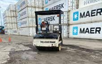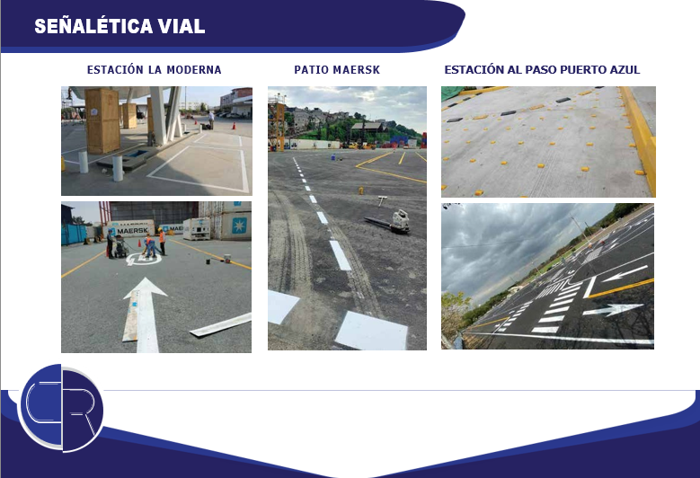 Señalización vial de patio de contenedores y numeración de posición de carga.